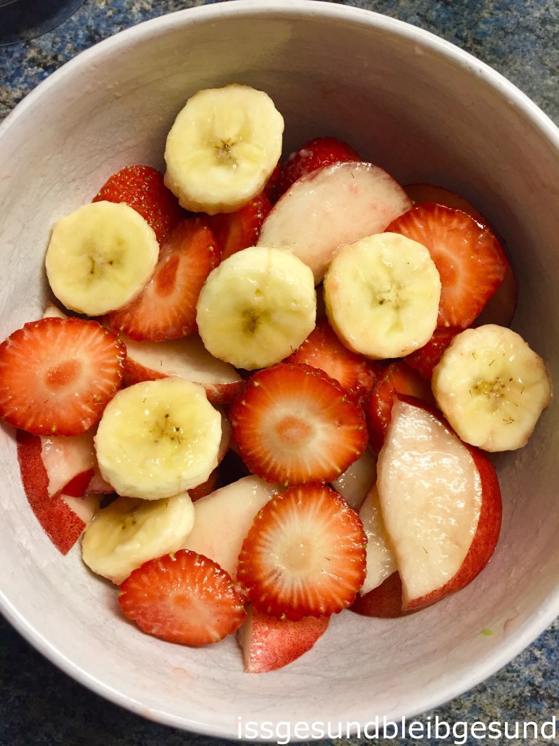 Da erfrischt ein Obstsalat mit Erdbeeren, Nektarinen und Banane und liefert volle Vitamin und Mineralstoffpower.