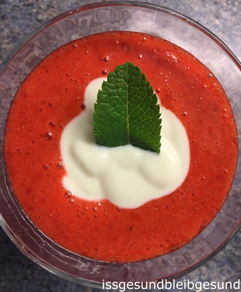 Mit Soja-Joghurt toppen und mit Minzeblatt garnieren.
