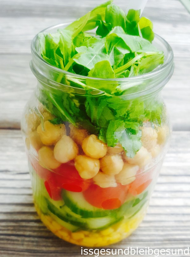 Vor dem Essen das Dressing über den Salat gießen. Schraubglas schließen und schütteln.