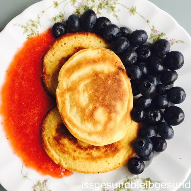 Was gibt es besseres an einem verregneten Samstag / Urlaubstag als Pancakes „American Style“ mit Heidelbeeren und Erdbeersauce