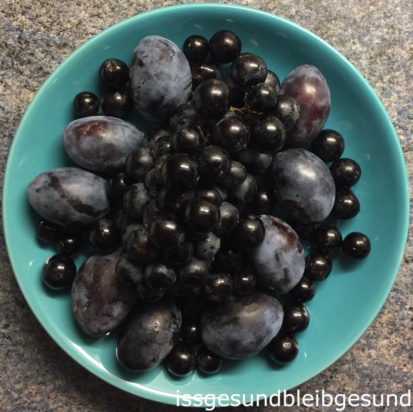 Ganz in Blau Ernte vom Wochenende Weintrauben und Zwetschken/Pflaumen voll mit Resveratrol dem sekundären Pflanzenstoff, der unsere Zellen schützt antioxidativ, antikanzerogen, antidiabetisch, kalorienrestriktiv. Ideal als gesunder Snack auch für unterwegs.