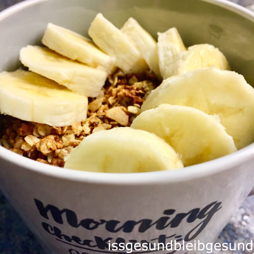Frühstück mit selbstgemachtem Granola auf Joghurt mit Banane 🍌