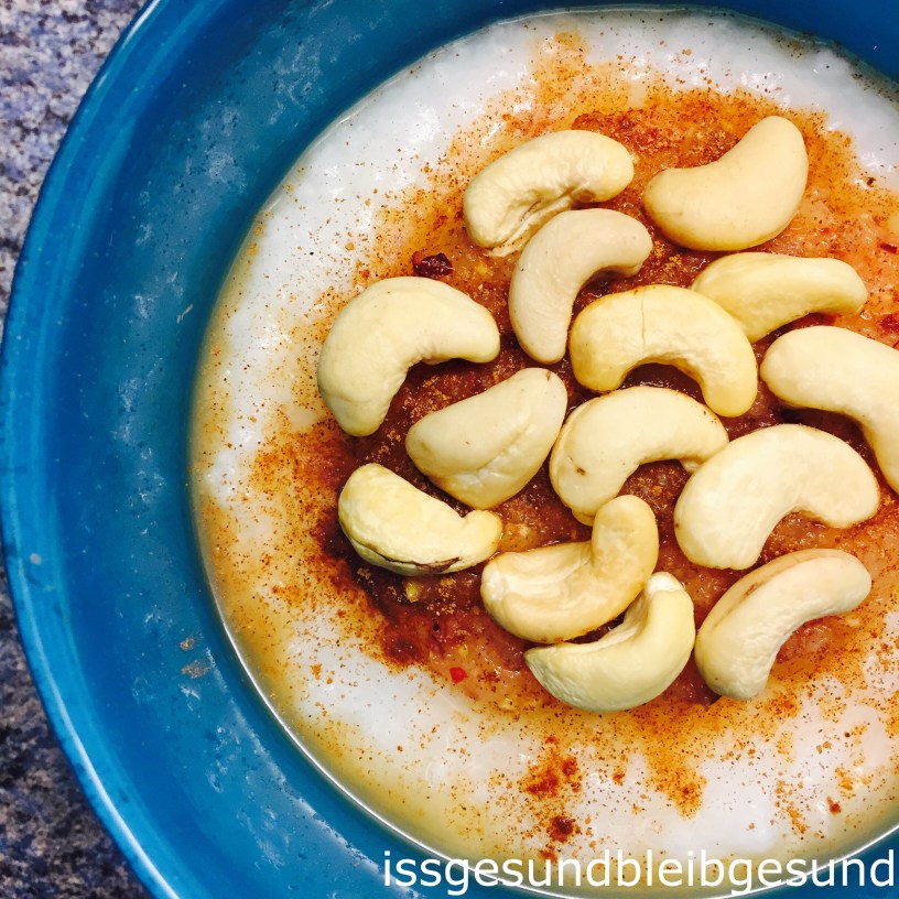 Mein Congee gab es heute mit Apfelmus, Zimt und Cashewnüssen 😋 Super als warmes Frühstück.