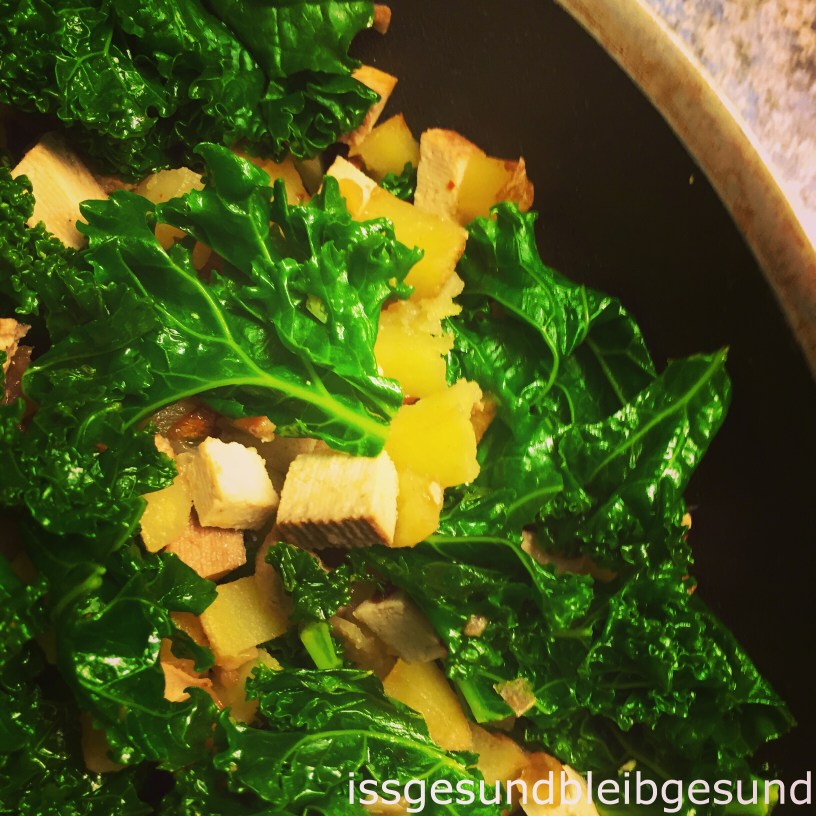 Zum Schluss den gut abgetropften Grünkohl unterheben und für 2-3 Min mitbraten. Fertig 👍