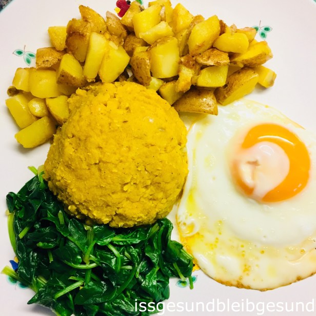 Linsen-Dal 🥣 Röstkartoffel, Blattspinat🍃und Spiegelei🍳 für die ganze Familie