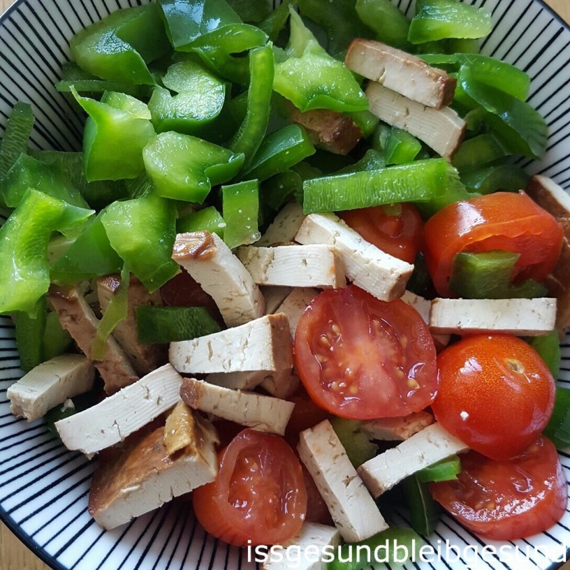 Gemüse und Tofu kleinwürfelig schneiden und würzen – Fertig.