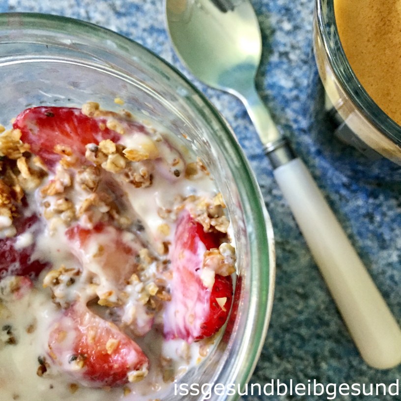 Vor dem Essen mit den kleingeschnittenen Erdbeeren und Granola toppen.