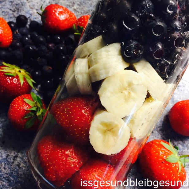 Felsenbirnen und Erdbeeren gut waschen und gemeinsam mit der in Scheiben geschnittenen Banane in den Smoothiemaker geben.