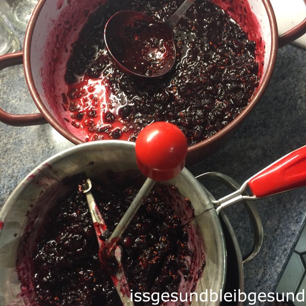 Um die kleinen Kerne zu entfernen (muss aber nicht sein) die eingekochte Masse durch ein Sieb streichen oder durch die „Flotte Lotte“* drehen – geht wesentlich schneller 😉