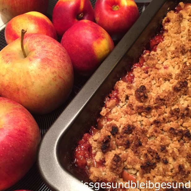 Zeit wieder in der Küche aktiv zu werden und auf Wunsch für meine “Süßen” ein leckeres Apfel-Nektarinen-Crumble ohne Industriezucker zu backen.