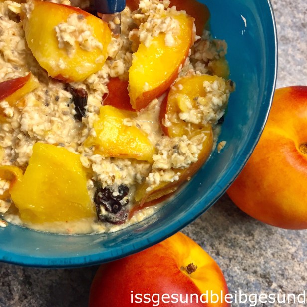 In der Zwischenzeit dein Lieblingstopping (bei mir waren es heute ein Nektarinen) klein schneiden und zum Porridge geben.