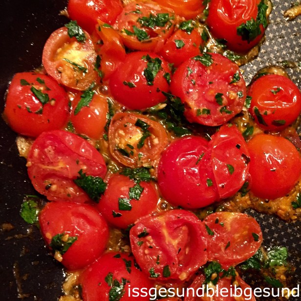 Petersilie grob hacken, Cherrytomaten halbieren. Knoblauch in Olivenöl anbraten, Tomaten dazugeben und solange schmoren, bis sie weich sind (5-7 Minuten), gehackte Petersilie dazugeben und noch 1-2 Minuten ziehen lassen.