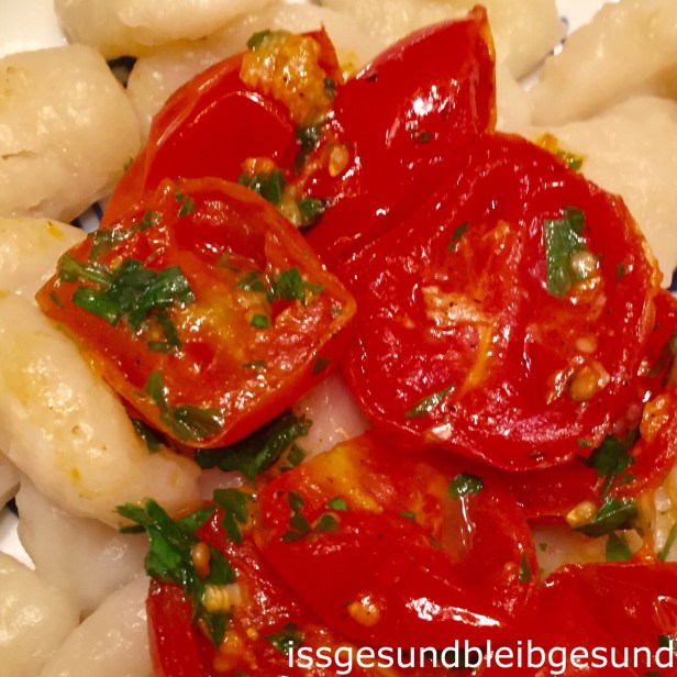 Endlich wieder Sonne und wärmere Temperaturen 🙂 Darum hatten wir heute Abend Lust auf Essen wie im Urlaub 🇮🇹 Bella Italia 🇮🇹 selbstgemachte, vegane Gnocchi aus nur 3 Zutaten, ganz einfach mit Tomaten aus dem Garten und Knoblauch – der pure Geschmack Italiens 🇮🇹