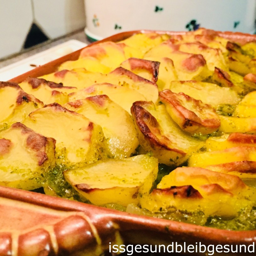 Die Kartoffeln schälen und in Scheiben schneiden. Zwiebel und Knoblauch schälen. Zwiebel ebenfalls in feine Scheiben schneiden, Knoblauch zerdrücken. In einer Pfanne die Zwiebel und den Knoblauch im Öl anschwitzen und mit gehackter Petersilie, Salz und Pfeffer vermischen.