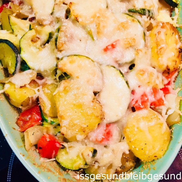 Die gekochten Kartoffel (ich hab sie nicht geschält) in Scheiben schneiden. Zwiebel und Knoblauch in etwas Olivenöl anbraten. Kartoffelscheiben zur Zwiebel-Knoblauchmischung dazugeben und mitrösten, ebenso die Zucchini und Paprika.