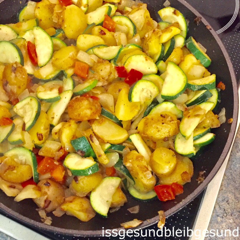 Die gekochten Kartoffel (ich hab sie nicht geschält) in Scheiben schneiden. Zwiebel und Knoblauch in etwas Olivenöl anbraten. Kartoffelscheiben zur Zwiebel-Knoblauchmischung dazugeben und mitrösten, ebenso die Zucchini und Paprika.
