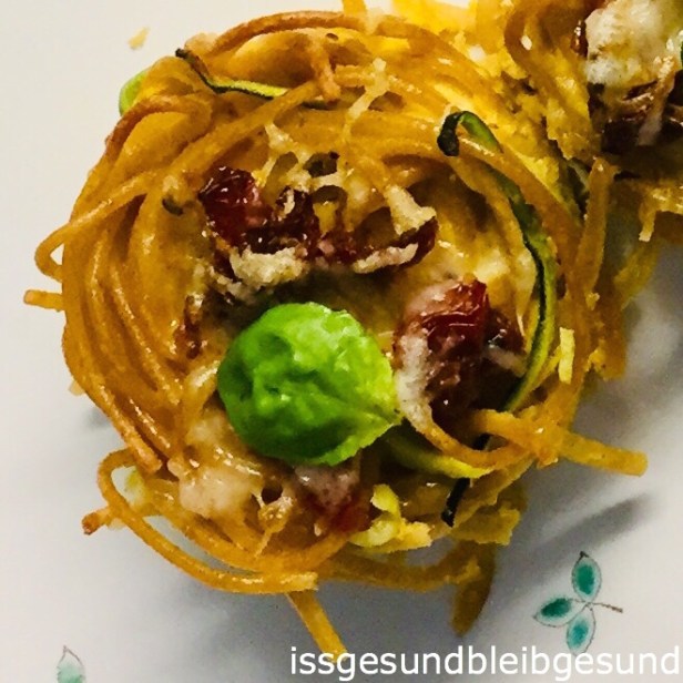 Gekochte Pasta gut abseihen und mit etwas Olivenöl vermischen. Zoodlles und die etwas abgekühlten Spaghetti vermengen und mit einer Gabel zu 12 gleichgroßen Portionen drehen und in das vorbereitete Muffinblech setzen.