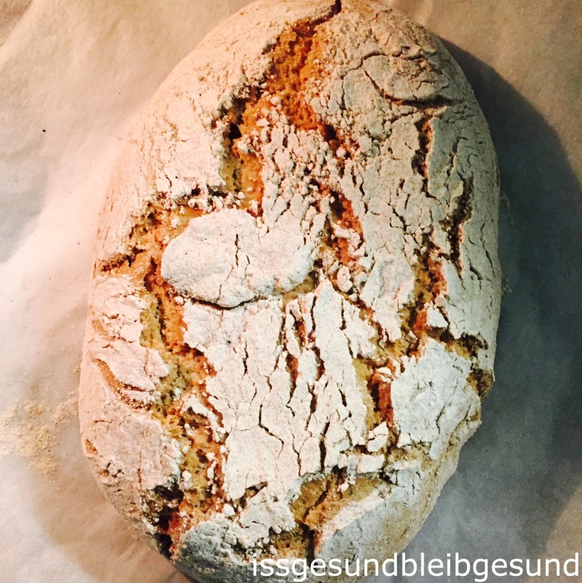 Alle Zutaten zu einem geschmeidigen Teig verarbeiten. Ca. 30 Minuten gehen lassen. Zu einem Laib formen, mit Mehl bestäuben und auf einem mit Backpapier ausgelegten Backblech im Backrohr auf mittlerer Schiene bei 150 Grad Umluft ca. 45 Minuten backen. (Backrohr wurde 10Min vorgeheizt).
