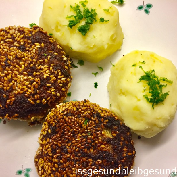 Sesam-Zucchini-Laibchen mit Kartoffelpüree