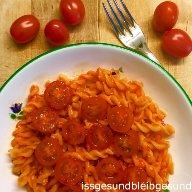 In der Zwischenzeit frischen Basilikum (je nach deinem Geschmack) in feine Streifen schneiden und unter die Sauce mischen. Fertige, abgeseihte Pasta unterrühren, auf Teller verteilen, einige halbierte Kirschtomaten darauf verteilen – servieren und genießen 😋