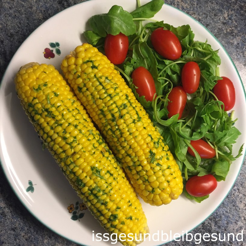 🌽 Gekochte Maiskolben mit Knoblauch-Kräuterbutter 🌽 angerichtet mit Rucola und Dattelparadeisern. Mais ist das perfekte Sommergemüse – schnell und leicht zubereitet 😉