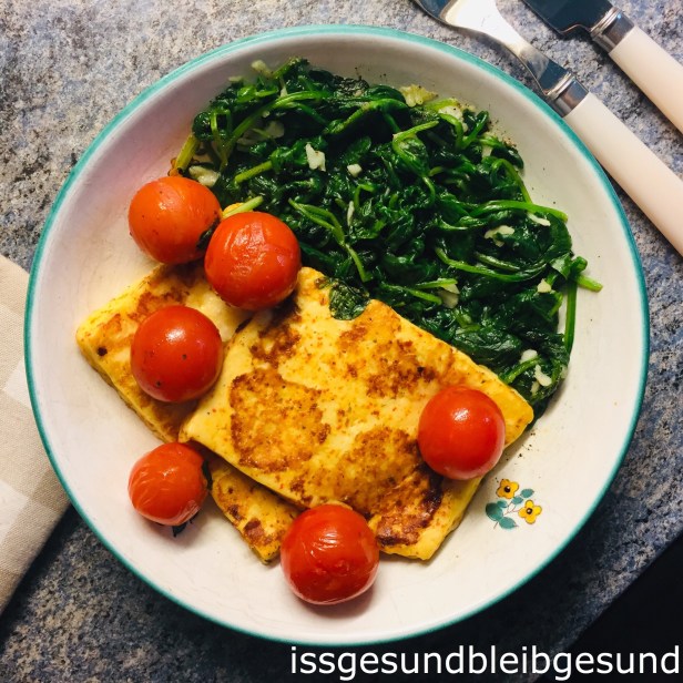 ⁃ Gebratener Tofu mit Blattspinat und Schmortomaten – schnell fertig und so lecker 😋