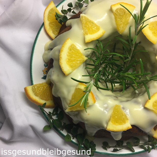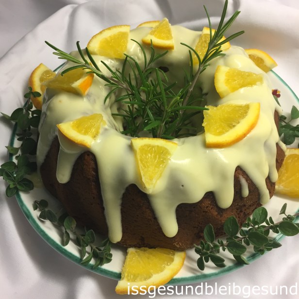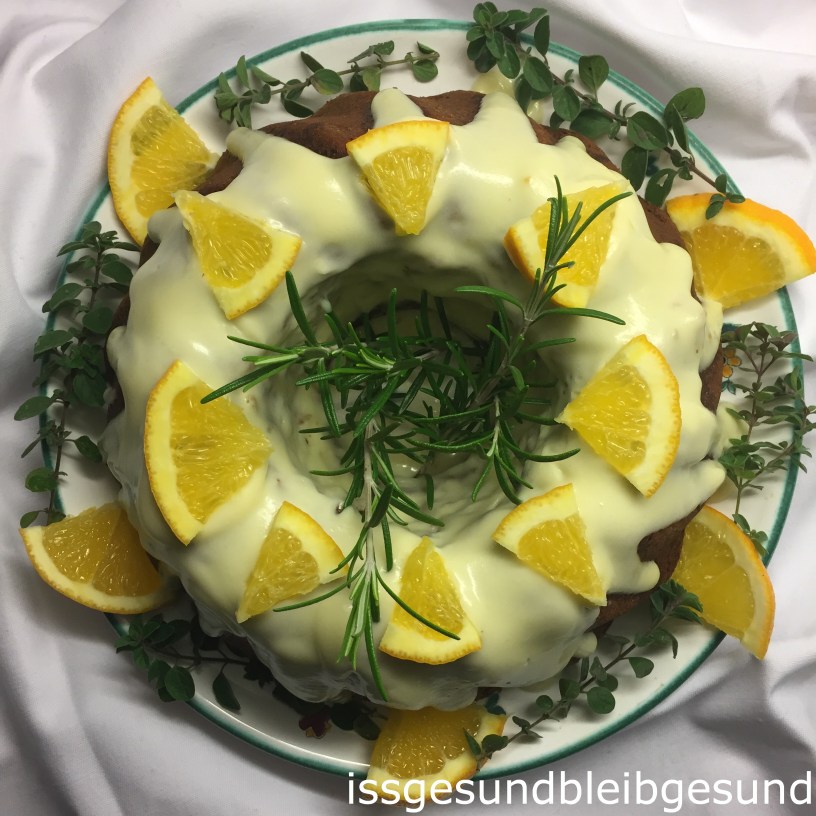 Das Frosting über den gut ausgekühlten Gugelhupf fließen lassen und mit Orangenscheiben und Kräutern dekorieren. Kühl stellen damit das Frosting etwas fester wird.