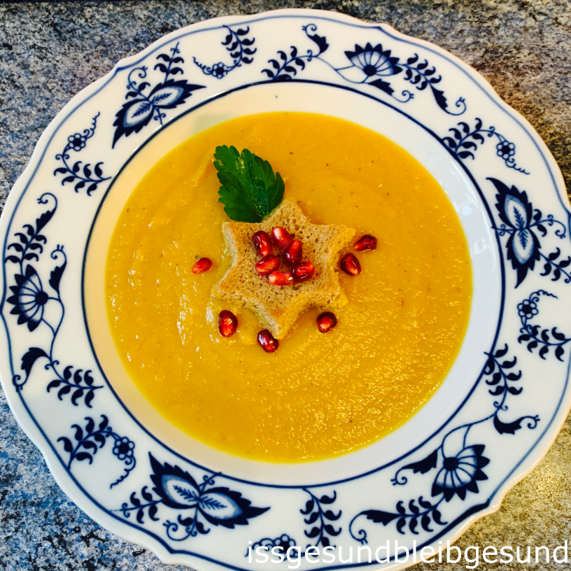 Sterne mit einen Keksausstecher aus den Dinkelbrotscheiben ausstechen und in etwas Olivenöl in einer Pfanne kurz anrösten. Suppe in die Teller füllen und mit je einem Dinkelstern, ein paar Granatapfelkernen und einem Blatt Petersilie garniert servieren.