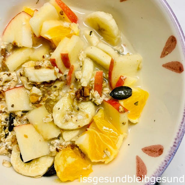 Obst waschen und in mundgerechte Stücke schneiden. Trockene Zutaten miteinander vermischen, mit dem Obst toppen und dem Nussdrink aufgießen und vermischen.