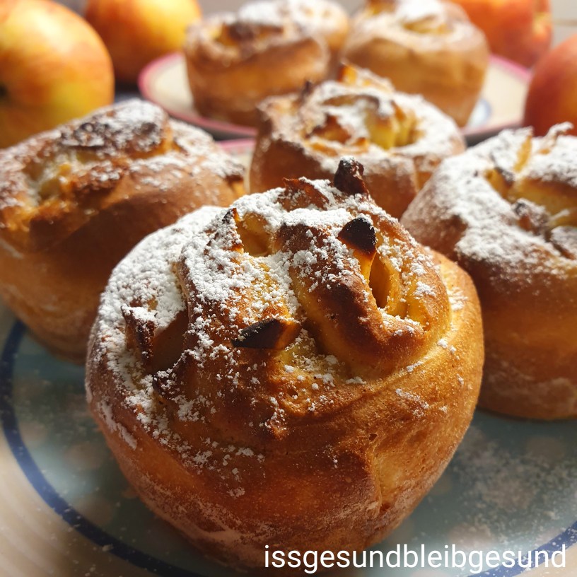 Den Germteig dünn ausrollen und die abgekühlten Apfelstücke drauf verteilen. Teig der Länge nach einrollen, in 12 Scheiben schneiden und mit der Schnittseite nach oben in die Muffinformen geben. Bei 180 Grad Umluft für 15 Minuten backen. In der Form auskühlen lassen und mit Birkenzucker bestreuen.