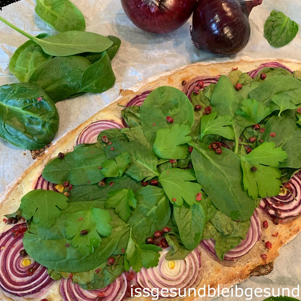 Flammkuchen 1 – vegan mit roten Zwiebel und Spinat