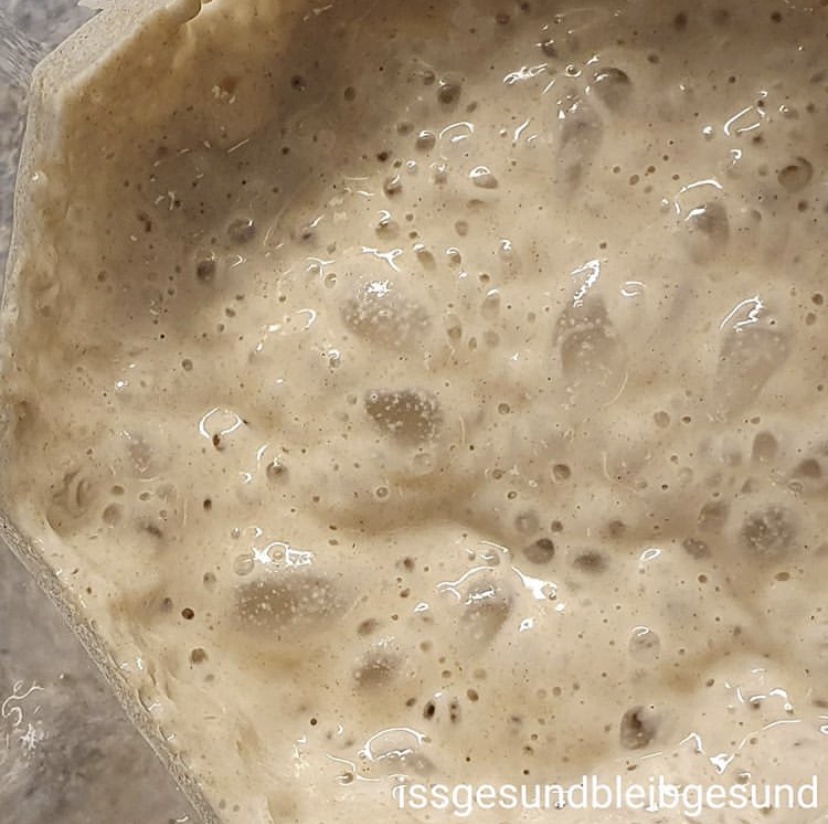 Unser „Homie“ (Name unseres Sauerteigansatz) blubbert fröhlich vor sich hin. Alles was er dafür braucht ist Mehl, Wasser und Zeit 🙂 Insgesamt brauchst du 200 g Roggenmehl Type 960 und 200 g lauwarmes Wasser für 4 Tage. Am Tag 1 50 g Roggenmehl und 50 g Wasser in einer Schüssel verrühren und für 24 Stunden bei Zimmertemperatur zugedeckt (zB mit Frischhaltefolie) ruhen lassen. Durch die Mikroorganismen beginnen sich Bläschen zu bilden. Genauso geht’s in den nächsten 3 Tagen weiter – dem Ansatz jeden Tag 50 g Roggenmehl und 50 g Wasser zumischen. Es entstehen immer mehr Bläschen, die vor sich hinblubbern. 😉 Dann ist es soweit – der Sauerteig ist bereit fürs Brotbacken 👍