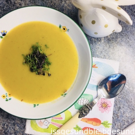 Gelbe Paprikasuppe mit Rotkohlsprossen und Kresse 🐰 aus der #keepcalmstayhomeeathealthy KücheEine Suppe so gelb wie das Gelbe vom (Oster)Ei 🐣 Dafür werden 500 g gelbe Paprikaschoten im Backofen bei etwa 180 °C gebraten bis sie Blasen schlagen, gehäutet und klein gewürfelt. 1 Zwiebel und 1 Knoblauchzehe fein gehackt und in etwas Olivenöl leicht angebraten. Die gewürfelten Paprika werden dazugeben, mit 500 ml Gemüsesuppe aufgegossen, püriert, mit Salz und Pfeffer abgeschmeckt und mit Rotkohlspeossen und Kresse garniert.