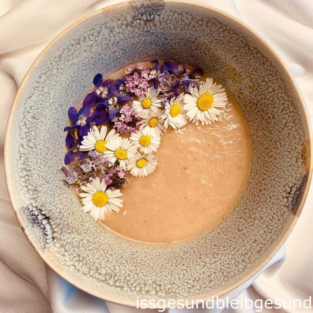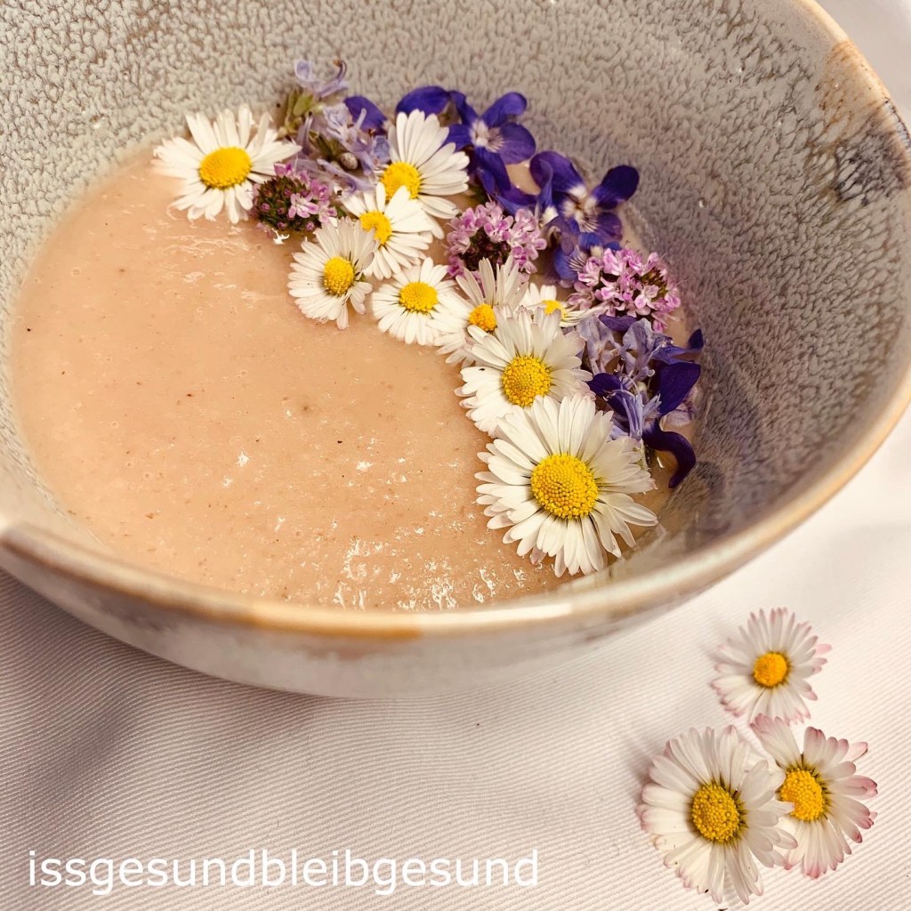 All you need for this fine vegan 🥣 Red radish soup 🥣 is 1 bundle of radish without the green, 1/2 onion, 1/2 tablespoon rapeseedoil, 250 ml Vegetable soup, 50 ml Coconut milk, salt and pepper. Roast the fine chopped onion together with the sliced radish, add vegetable soup and let it simmer for 10-15 minutes. Add coconut milk and let it boil briefly. Purée the soup in a blender and season it with salt and pepper. Decorate the soup with blossoms from your garden. 👍 Take care and stay healthy 👍 .