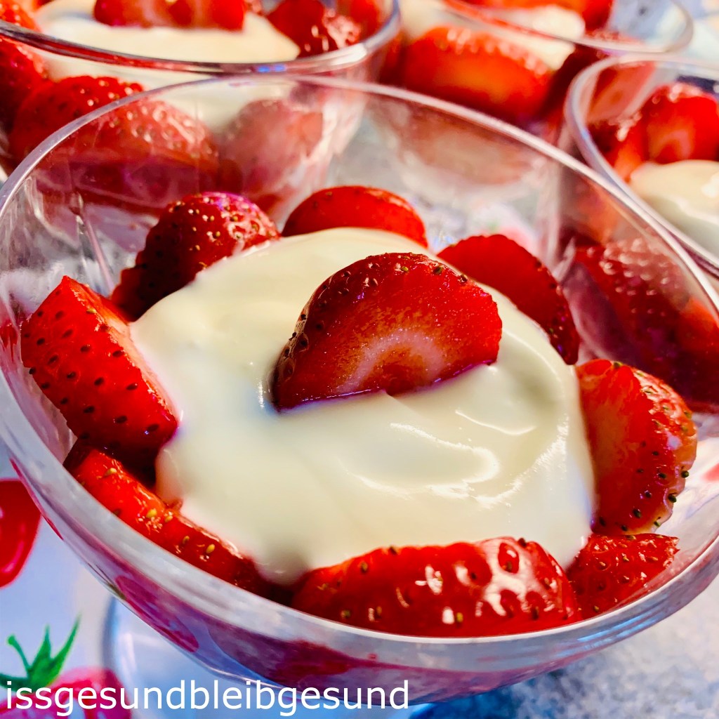 Als Basis kommen zerbröselte Cantuccini ins Glas und darauf wird die Hälfte einer aufgeschlagenen Creme aus 500 g veganem Topfen / bzw. für die vegetarische Variante Mascarpone, 150 g Kokosjoghurt, 1 EL Birkenzucker und geriebener Vanille verteilt. Dann folgen die zuvor mit 1 EL Birkenzucker und 1 EL Zitronensaft pürierten 300 g Erdbeeren und zum Schluss die 2. Hälfte der Creme. Dekoriert wird mit 200 g Erdbeerstücken. 🍓 Gut gekühlt genießen 🍓