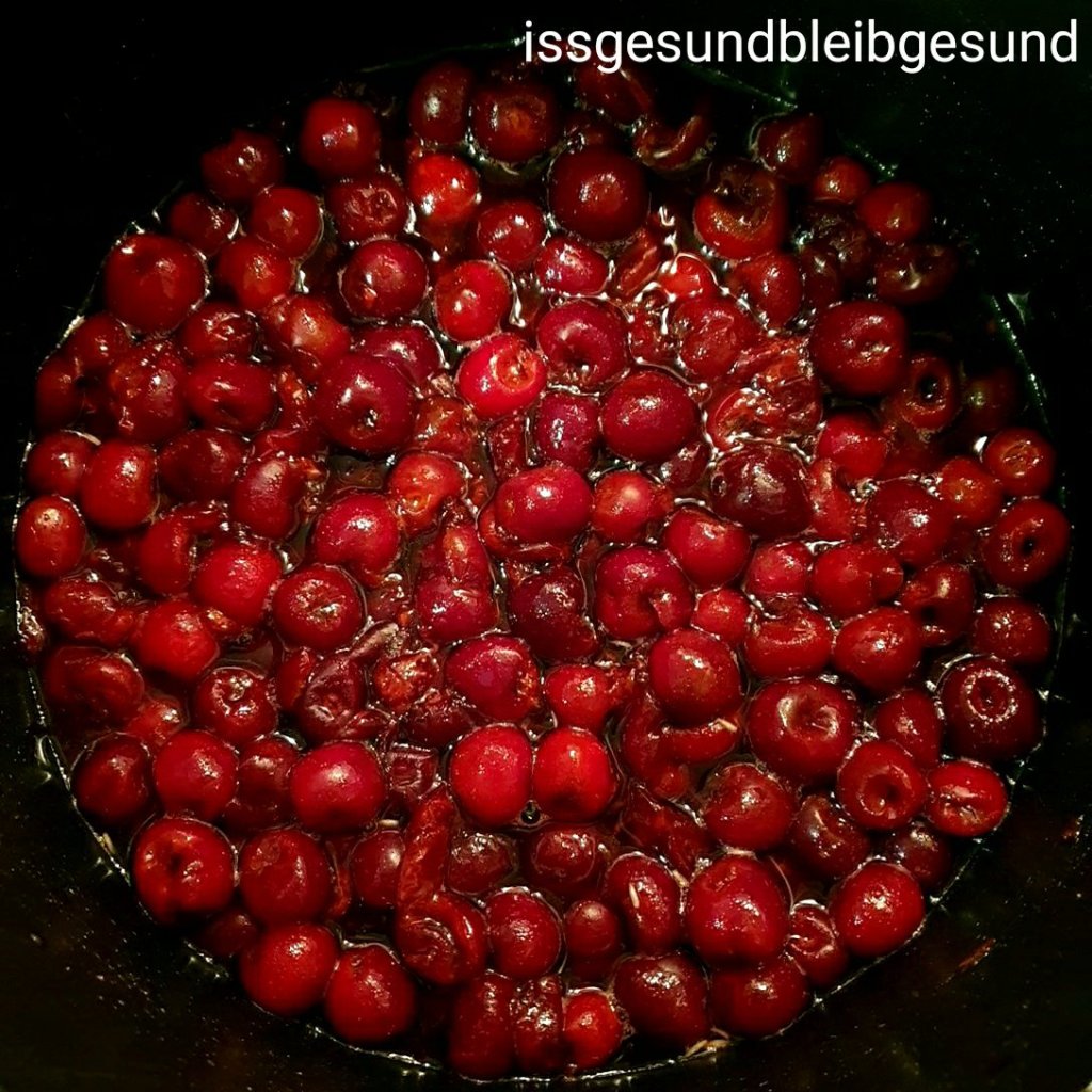 Dafür werden je 1,5 kg entsteinte Kirschen mit 500 g Gelier-Birkenzucker in einem Topf vermischt und für 2 Stunden stehen gelassen.