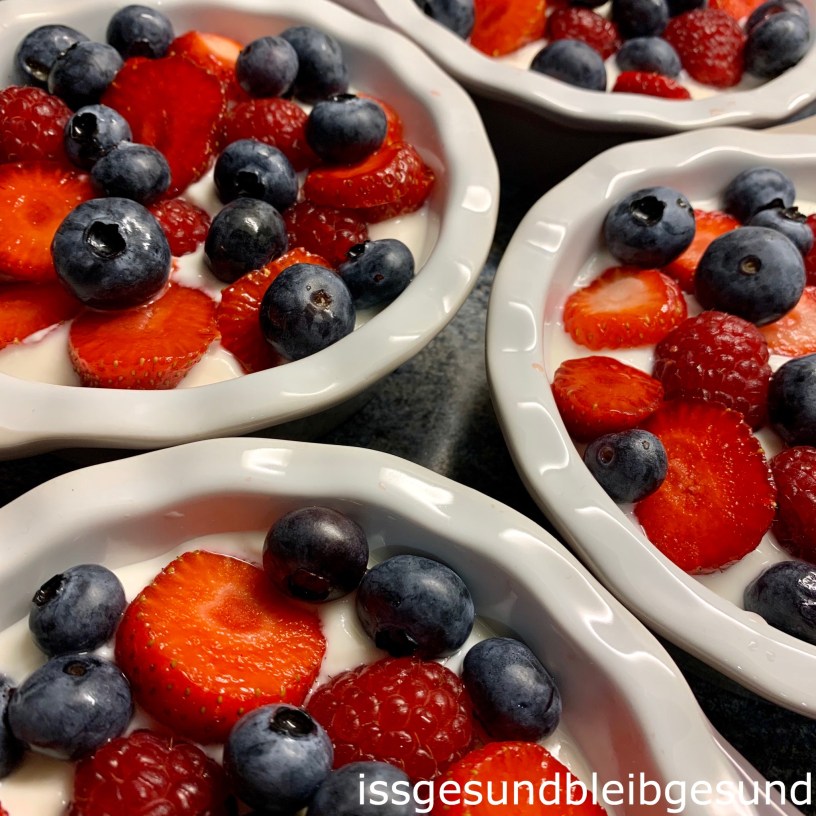 Für diese leckere Abkühlung brauchst du nur 3 Zutaten – Du rührst 500 g Kokosjoghurt natur (oder ein Naturjoghurt deiner Wahl) mit 3-4 EL Dattelmus oder Kokosblütensirup cremig und füllst die Masse in kleine Auflaufformen. Beeren – Erdbeeren, Himbeeren und Heidelbeeren – auf die Creme legen und die Formen im Gefrierschrank ein paar Stunden tiefkühlen.