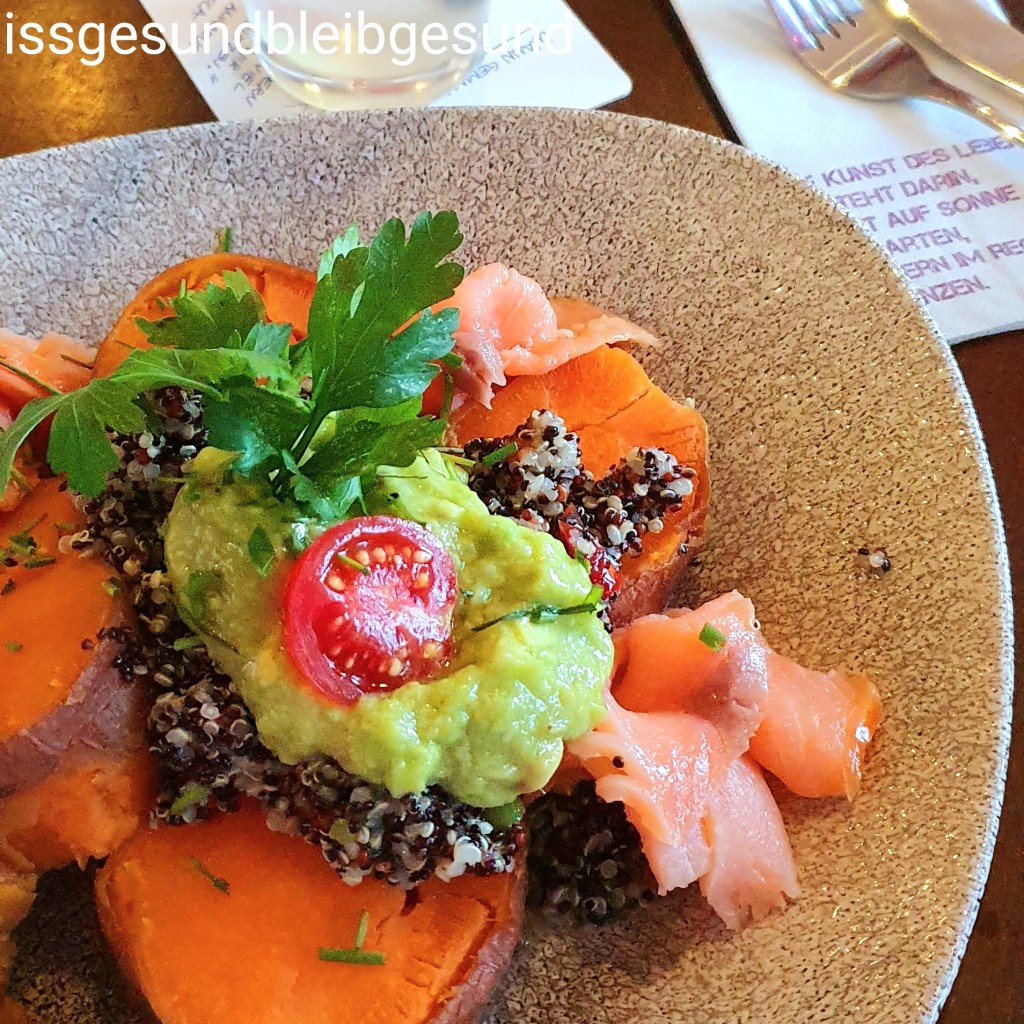 🍠 Quinoa-Süßkartoffel mit Avocadocreme und Lachs 🥑 Buntes Essen als Stimmungsaufheller an trüben, regnerischen Tagen 🙂 nach dem Motto: „Die Kunst zu Leben besteht darin, zu lernen, im Regen zu tanzen, anstatt auf die Sonne zu warten.“🙂