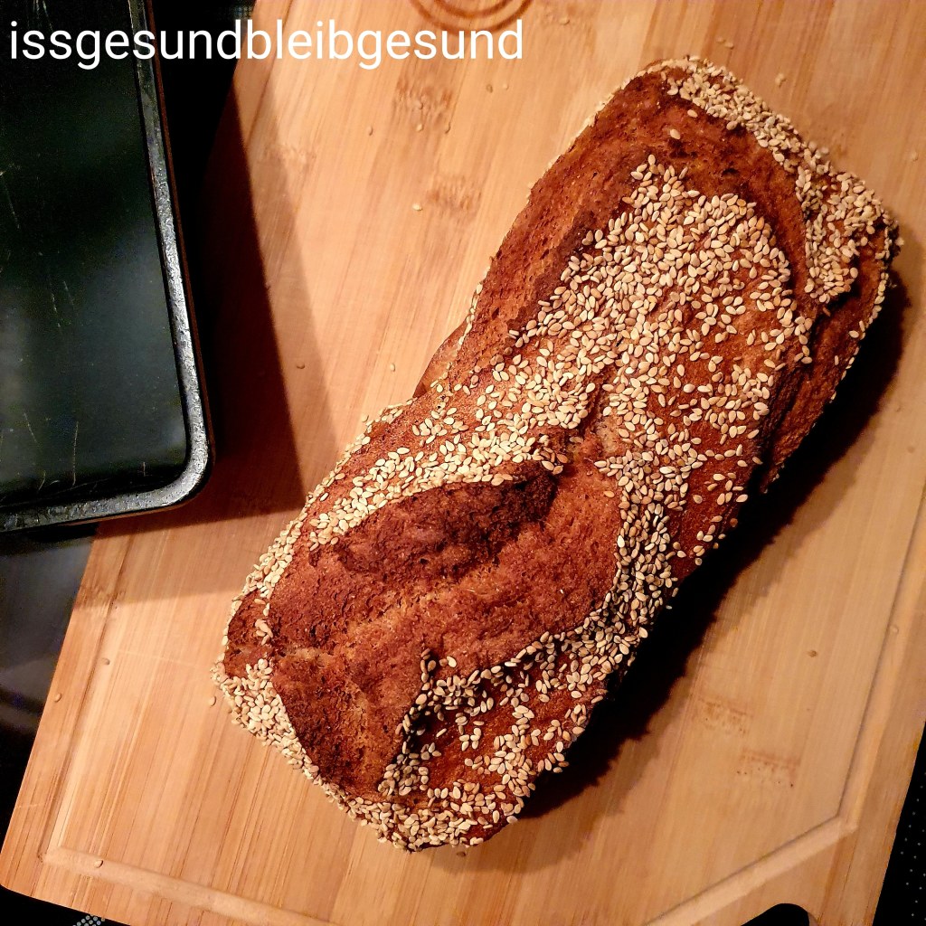 Dafür werden 500 g Vollkorn- Dinkelmehl, 1 Pkg. Trockenhefe (Germ), 1 EL Salz, 5 EL Sesam vermischt und mit 500 ml warmen Wasser zu einen Teig verrührt. In eine mit Backpapier ausgelegte Kastenform füllen, mit Sesam bestreuen und ab ins ! kalte ! Backrohr. Bei 180 Grad, Umluft 65 Min. backen. Danach auf einem Brett auskühlen lassen.