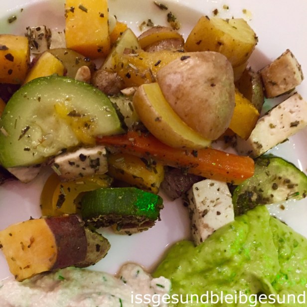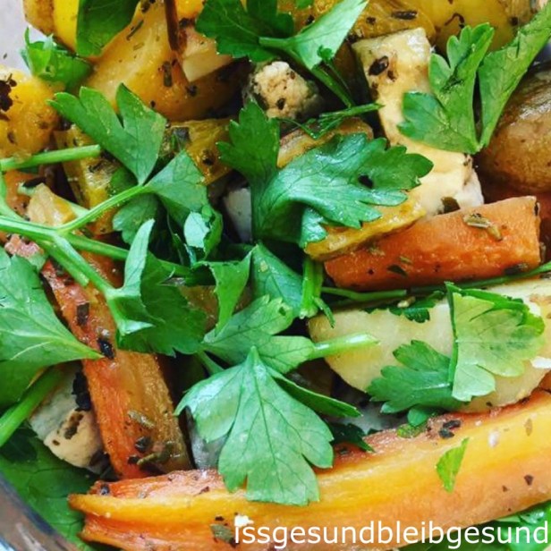Gemüse aus dem Ofen geht ja immer, ist schnell zubereitet und liefert reichlich Vitamine, Mineralstoffe, Ballaststoffe und sekundäre Pflanzenstoffe. Räuchertofu ergänzt das Gericht mit pflanzlichem Eiweiß.
