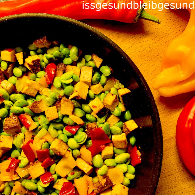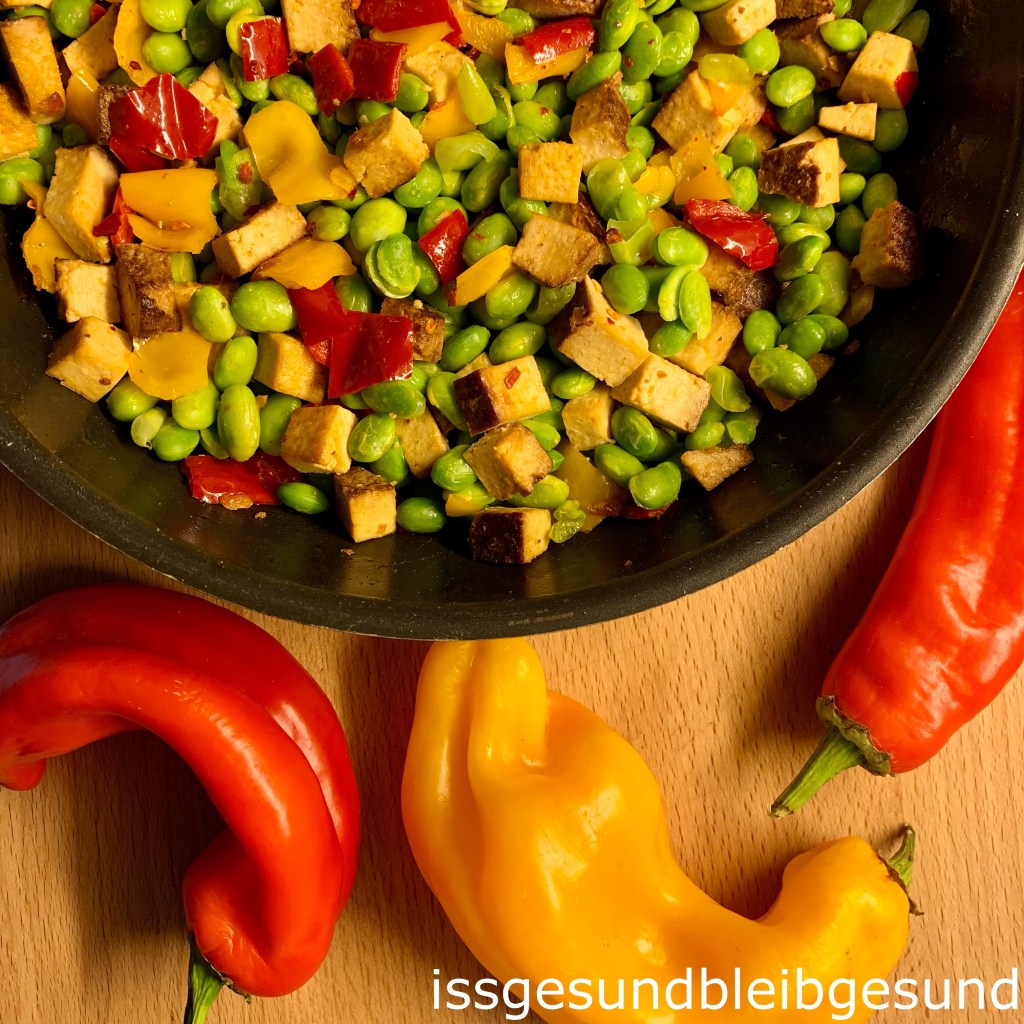 Während die TK-Sojabohnen für 5 Minuten in Salzwasser köcheln, werden die Zwiebel und die Knoblauchzehen fein geschnitten, die Paprika gewaschen, geputzt und zerkleinert. Den Räuchertofu haben wir in Würfel geschnitten. Zwiebel und Knoblauch werden in etwas Olivenöl angeschwitzt, dann kommen die Paprika- und die Tofustücke dazu und werden knusprig angebraten. Zum Abschluss werden die Sojabohnen untergemischt und das ganze mit Salz und Pfeffer abgeschmeckt.
