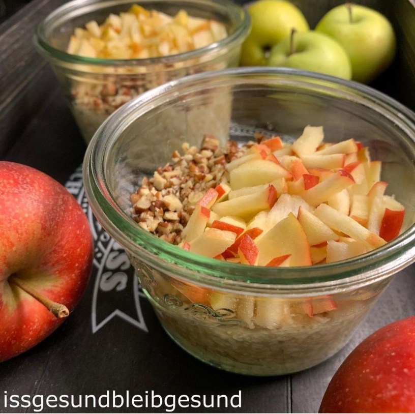 Über Nacht rasten die Overnight-Oats im Kühlschrank und am Morgen wird mit frischen Apfelstückchen und gehackten Pekannüssen getoppt.