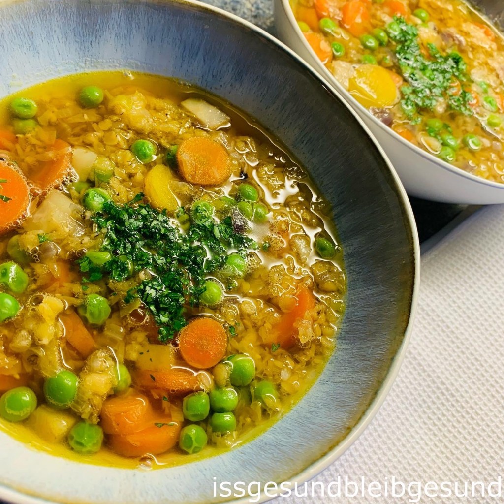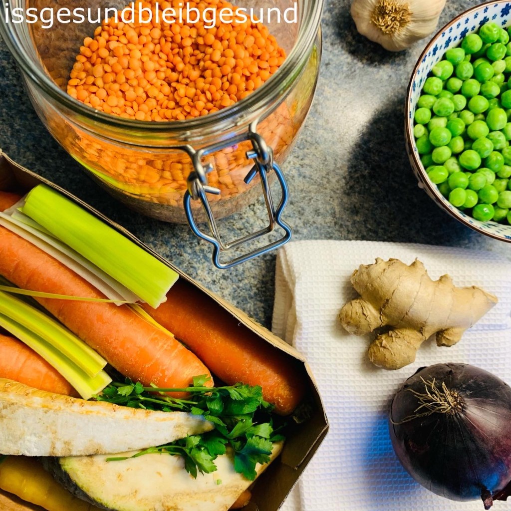 1 Bund Suppengemüse mit 3 Karotten, Petersilie, 1 Stück Selleriewurzel, 1 Stück Lauch waschen, putzen und in kleine Stücke schneiden. 1 gehackte Zwiebel und in Stücke geschnittenen Lauch in etwas Olivenöl andünsten. Dann die fein gehackten 2 Knoblauchzehen und geriebenen Ingwer 1-1,5 cm dazugeben und mitdünsten. Mit 1,5 Liter Gemüsesuppe aufgießen und aufkochen, 250g gut gewaschene rote Linsen dazugeben. 10 Minuten köcheln lassen. 100 g Erbsen dazugeben und weitere 5 Minuten kochen. Mit Pfeffer, Salz abschmecken und mit gehackter Petersilie servieren. 🍲