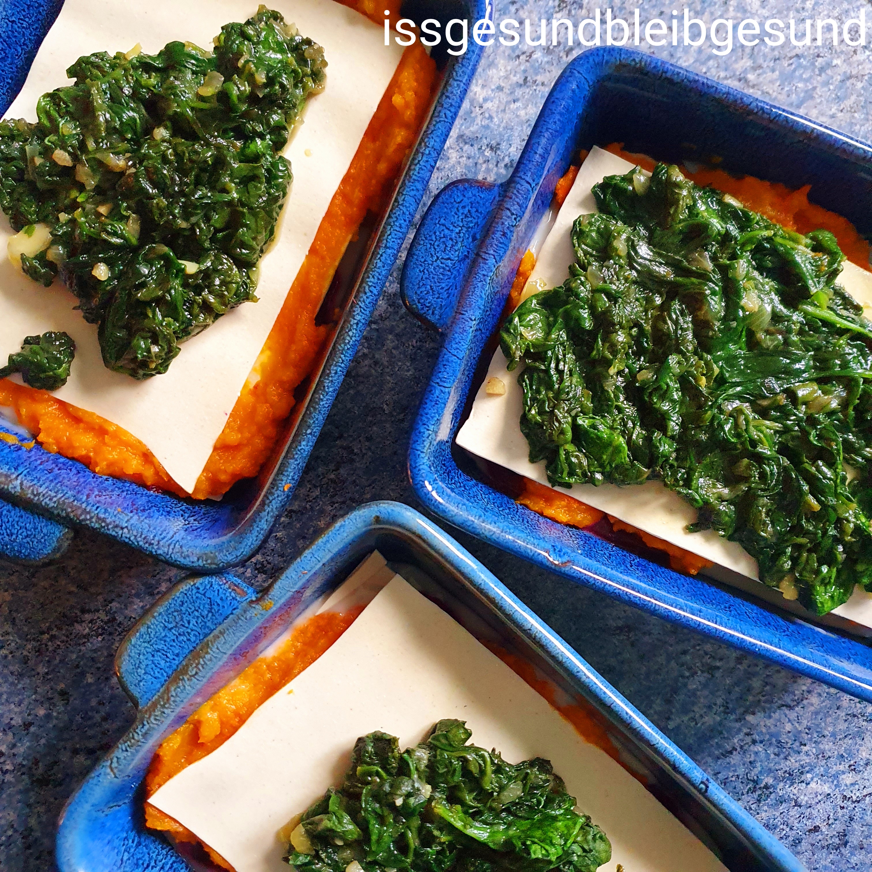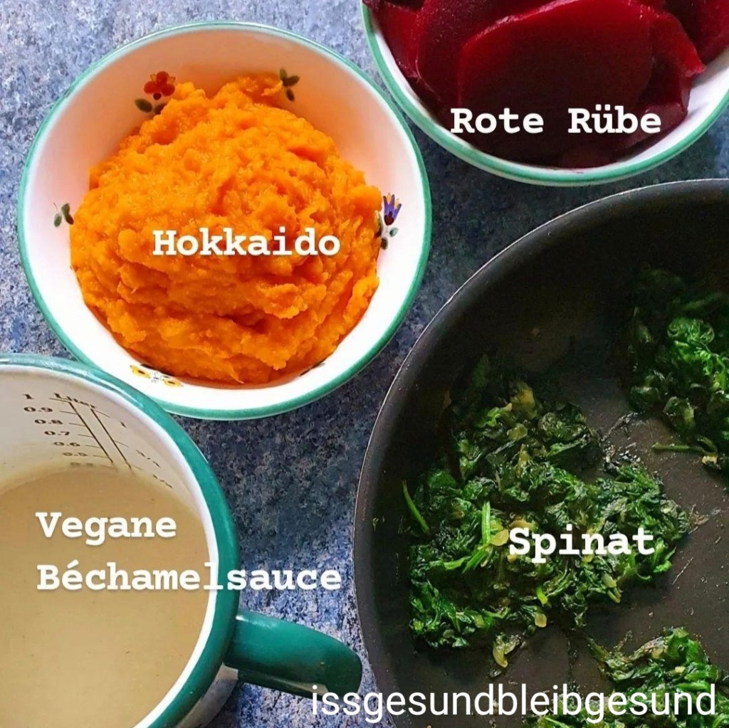 Nun gehts ans Schichten der Lasagne: Etwas Béchamel auf dem Boden der Auflaufform verteilen. Lasagneblatt, Rote Rüben, Lassgneblatt, Béchamel, Hokkaido, Lassgneblatt, Béchamel, Spinat u.s.w. in die Form schichten. Mit Lasagneblatt und Béchamel-Sauce beenden.