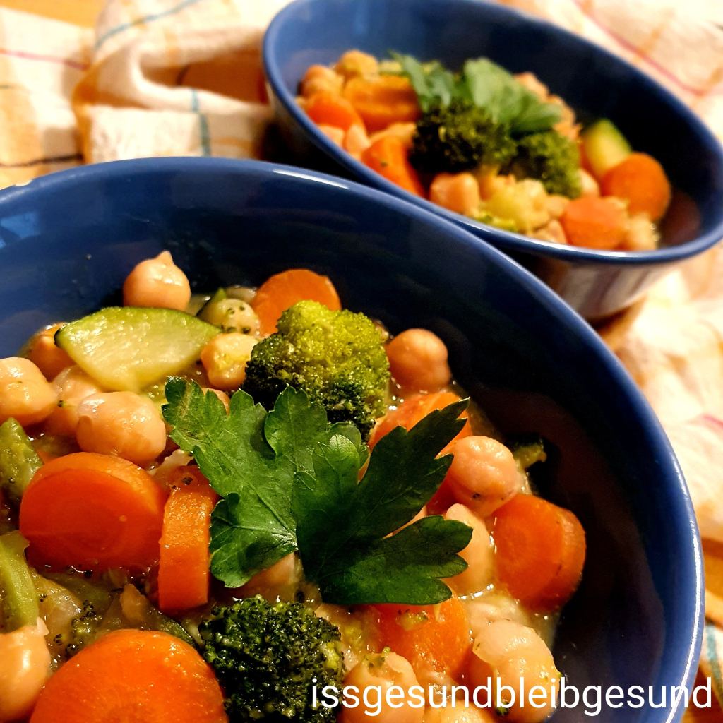Kichererbsen und Brokkoli dazugeben und etwa 5 Minuten köcheln lassen. Mit Petersilie dekorieren. Fertig zum Genießen.