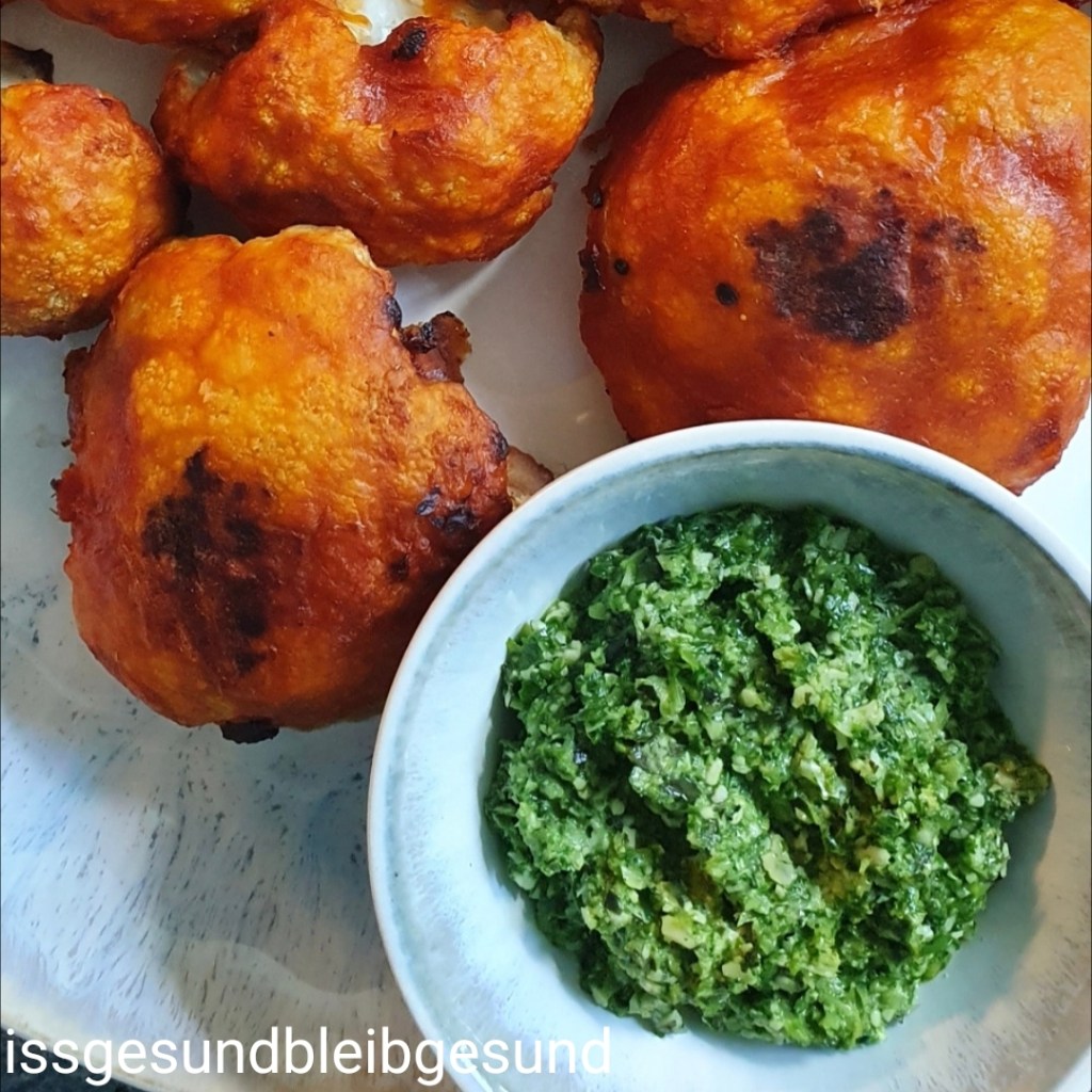 • Fertige Buffalowings mit Karfiolblätter-Pesto und der restlichen BBQ-Sauce servieren.