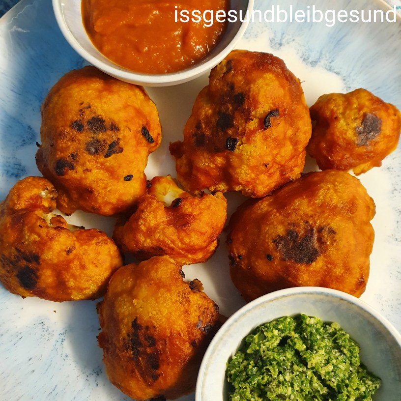 • Karfiolröschen in die Panade tunken, sodass sie komplett bedeckt sind. Gut abschütteln und auf einem mit Backpapier ausgelegten Blech verteilen.. Dann kommen die Röschen für 20 – 30 Minuten bei 180 Grad Umluft ins Backrohr bis sie goldbraun sind. In der Halbzeit einmal wenden.
