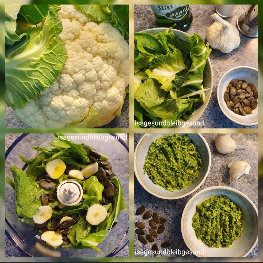 • Karfiolblätter-Pesto zubereiten – Während die Röschen im Ofen braten wird das Pesto zubereitet. Dafür werden die gewaschenen Blätter und der Strunk klein geschnitten und im Multizerkleinerer mit den anderen Zutaten zu einem Pesto verarbeitet. Mit den Gewürzen abschmecken.