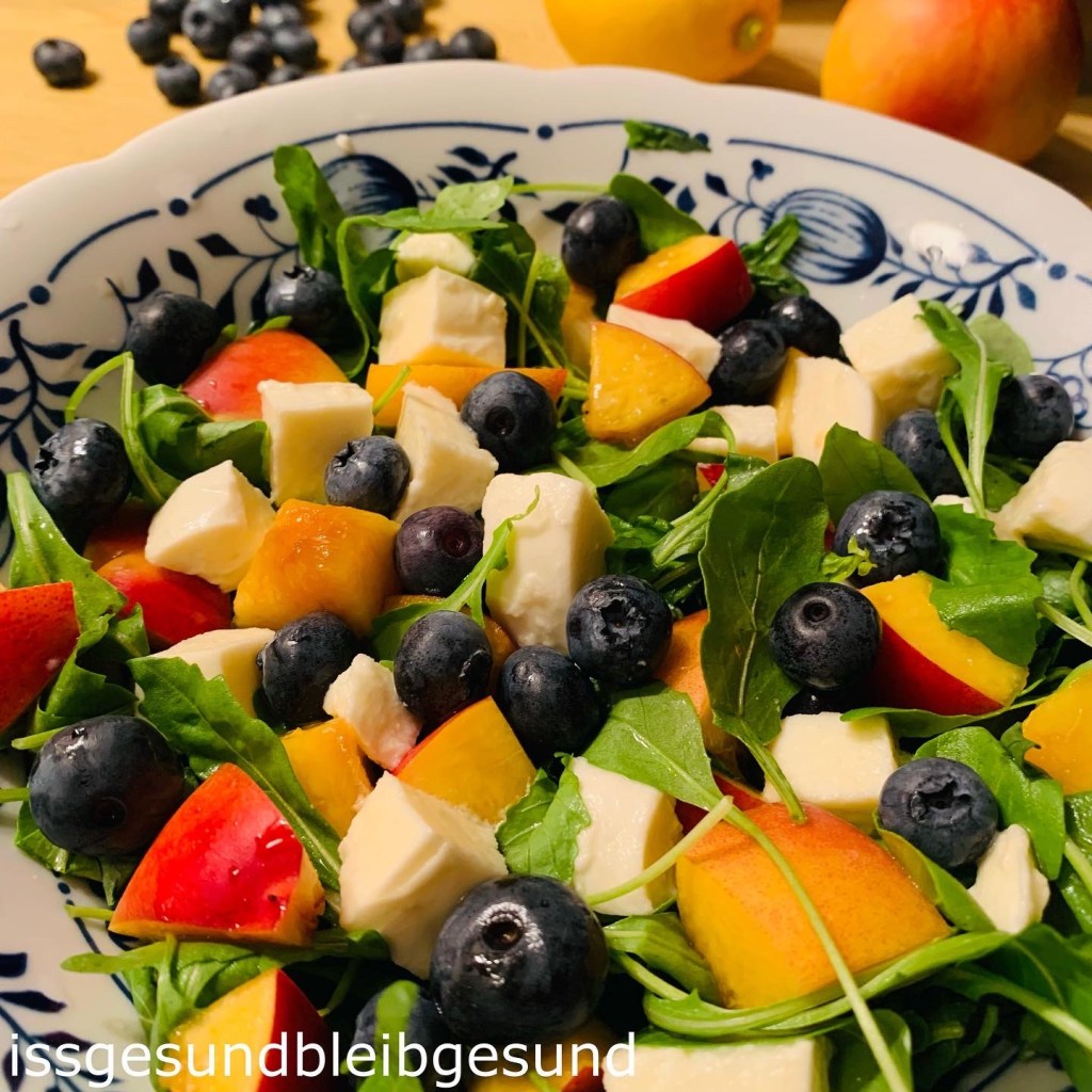 Rucola waschen, trockenschütteln und auf zwei Tellern anrichten. Mozzarella in kleine Würfel schneiden. Heidelbeeren waschen. Nektarinen waschen, entkernen und in kleine Stücke schneiden. Diese gemeinsam mit den Heidelbeeren und den Mozzarellawürfel auf dem Rucola verteilen. Mit Olivenöl, Zitronensaft und Pfeffer marinieren.