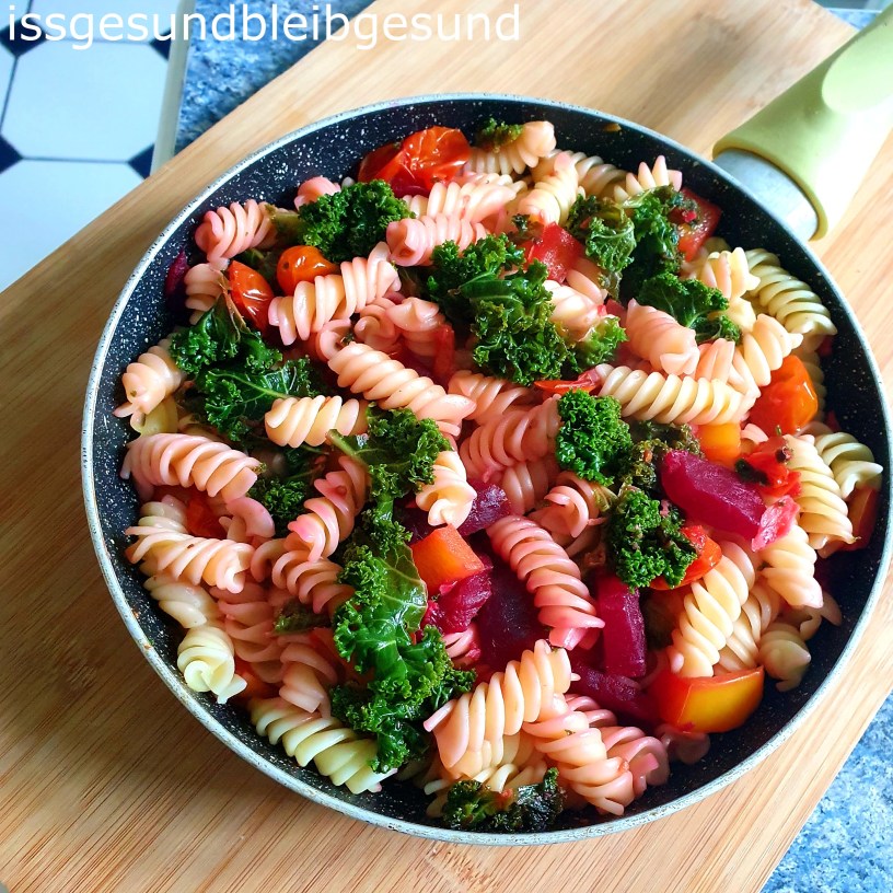 🌈 Eat the rainbow-Nudelpfanne 🌈 aus der Resteküche. Am Montag werden bei uns oft Überbleibsel vom Wochenende verarbeitet, so wie diese Nudelpfanne mit Grünkohl und roten Rüben.